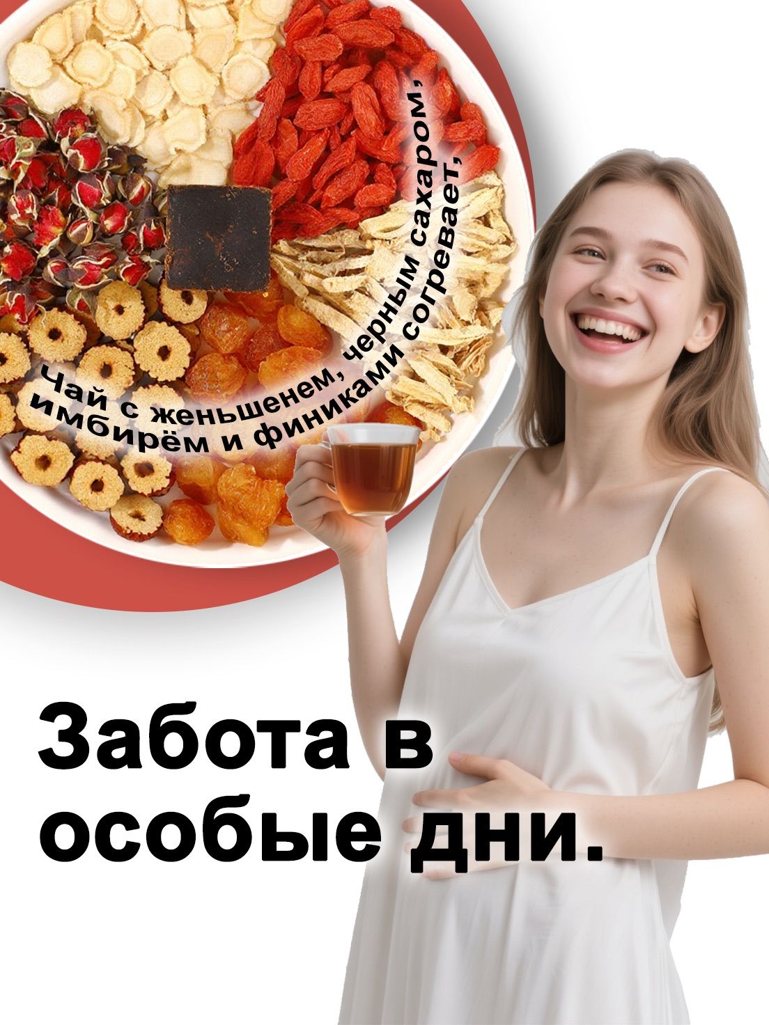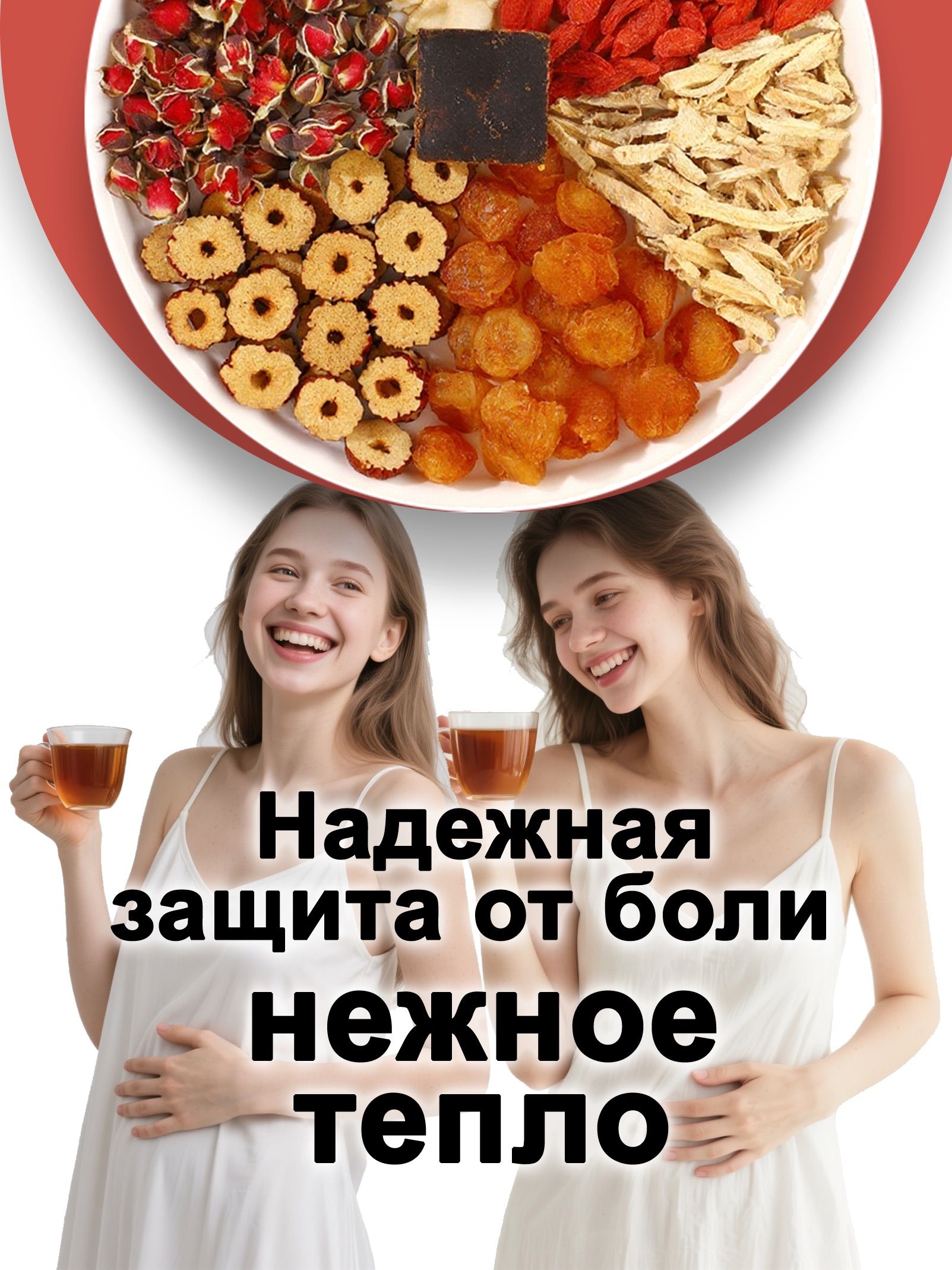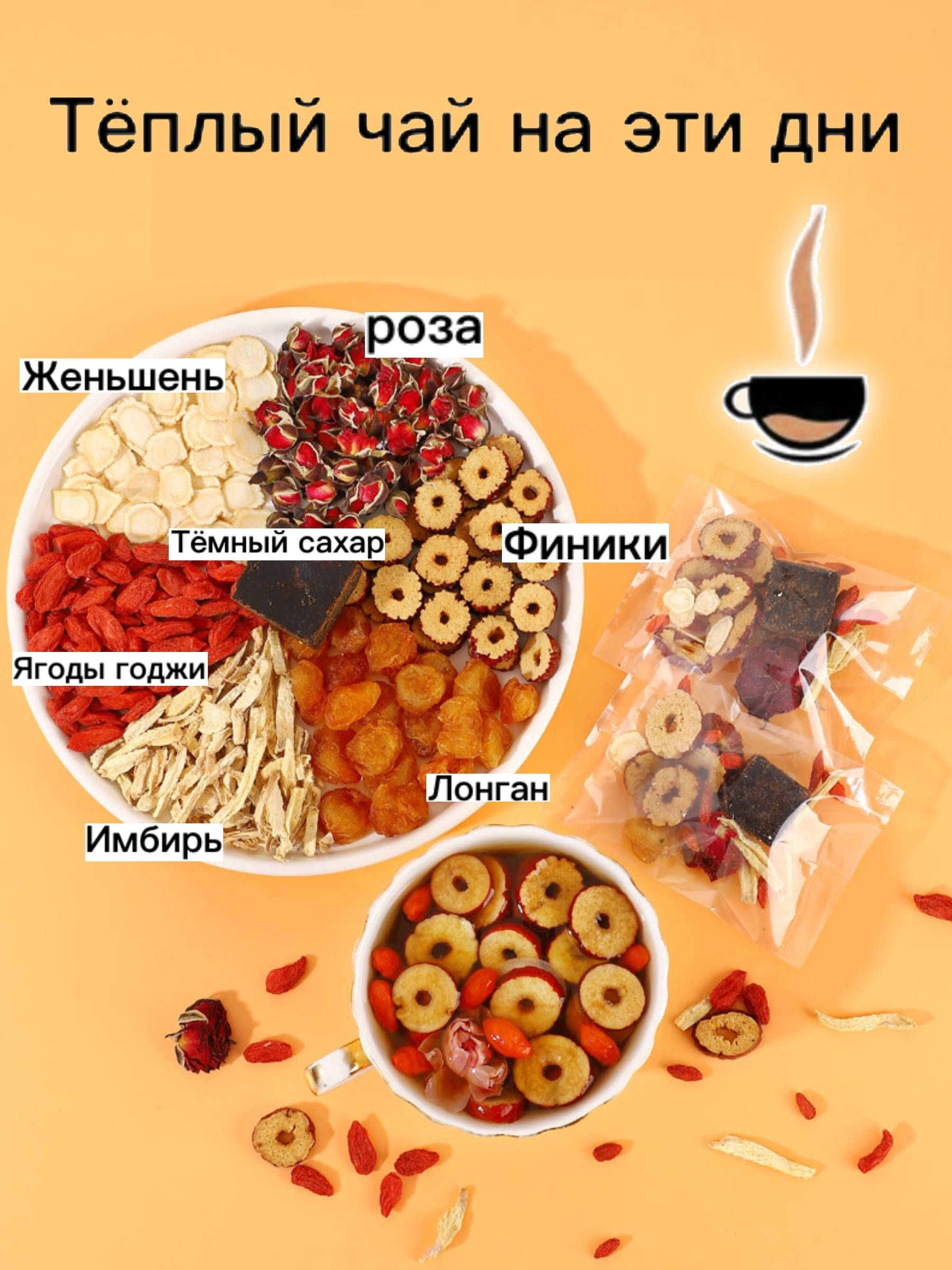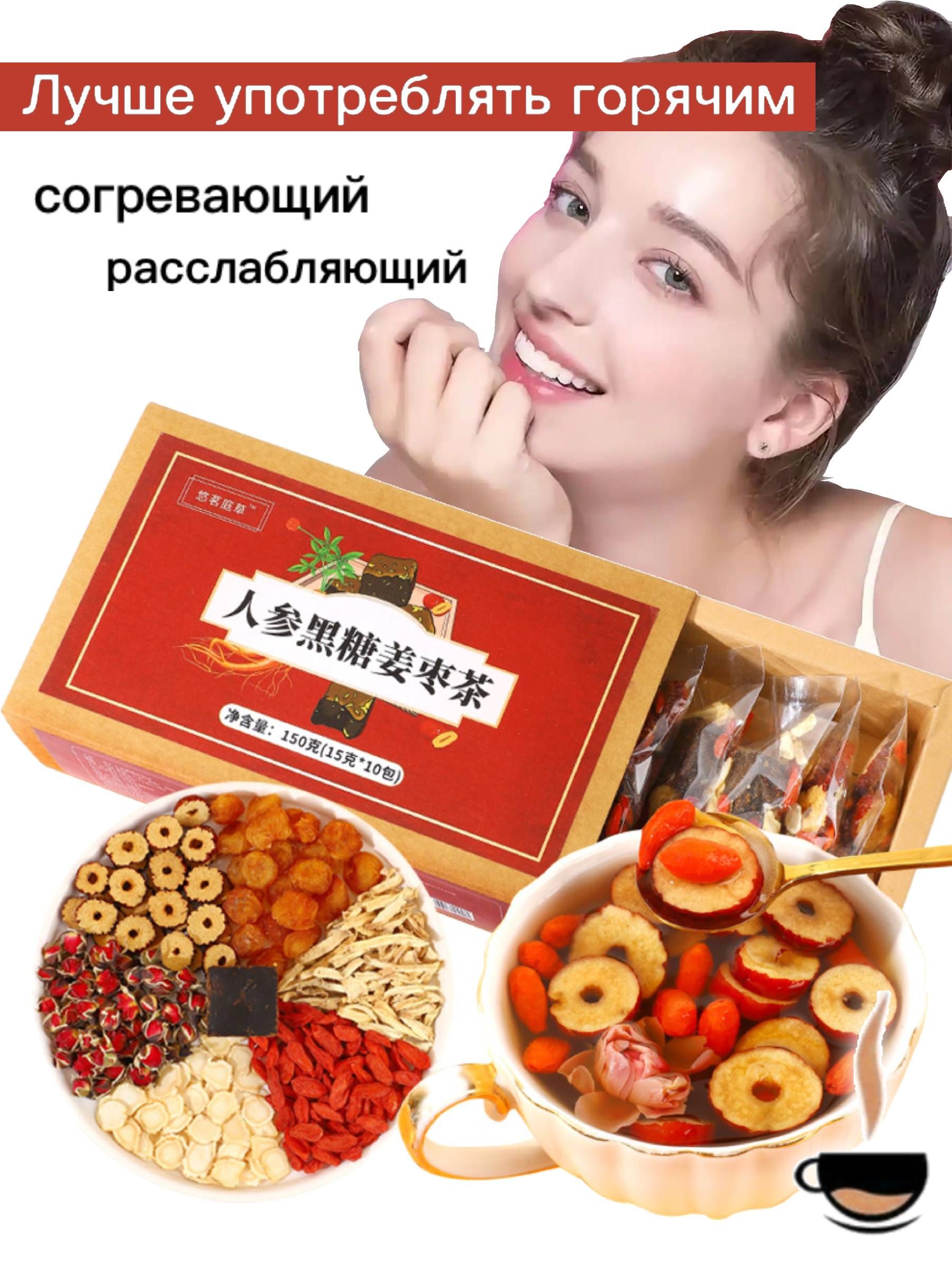 Чай с чёрным сахаром, розой, красным фиником, лонганом, имбирём, женьшенем и ягодами годжи для периода месячных, 10 пакетиков по 15 г, Китайский чай