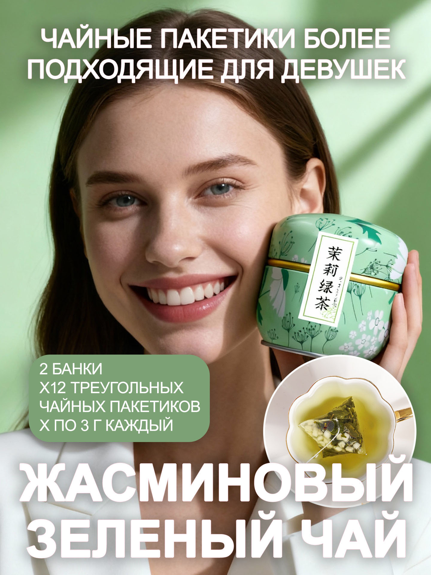 Жасминовый зелёный чай в пирамидках 3 г, 12 шт. в жестяной банке, 2 банки лёгкий цветочный аромат, 24 чашки