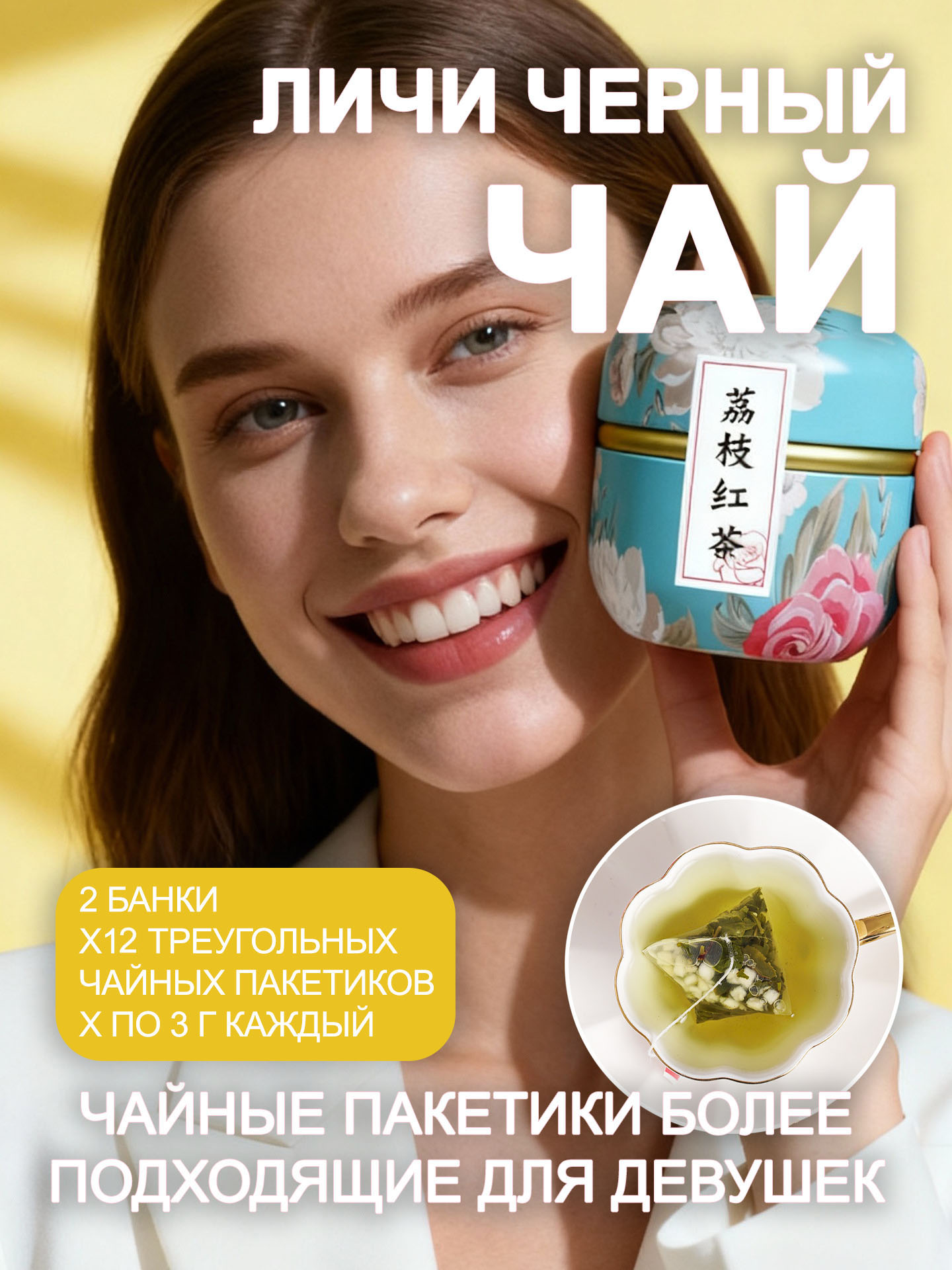 Личи чёрный чай в пирамидках 3 г, 12 шт. в жестяной банке, 2 банки тропический аромат и бархатное тело, 24 чашки